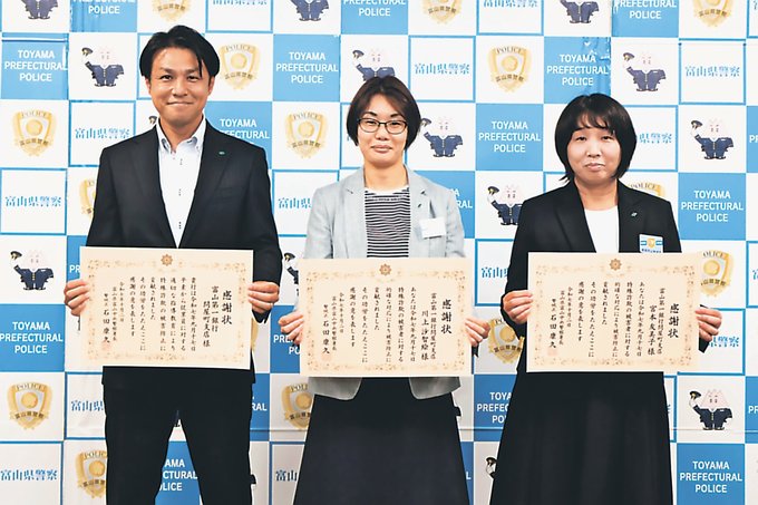 特殊詐欺(オレオレ詐欺)の被害を未然に防いだとして、富山県の富山中央署は2日、富山第一銀行問屋町支店(松原晋吾支店長)と、行員の川上沙智絵さん(40)、宮本友美子支店長代理(46)に署長感謝状を贈った。