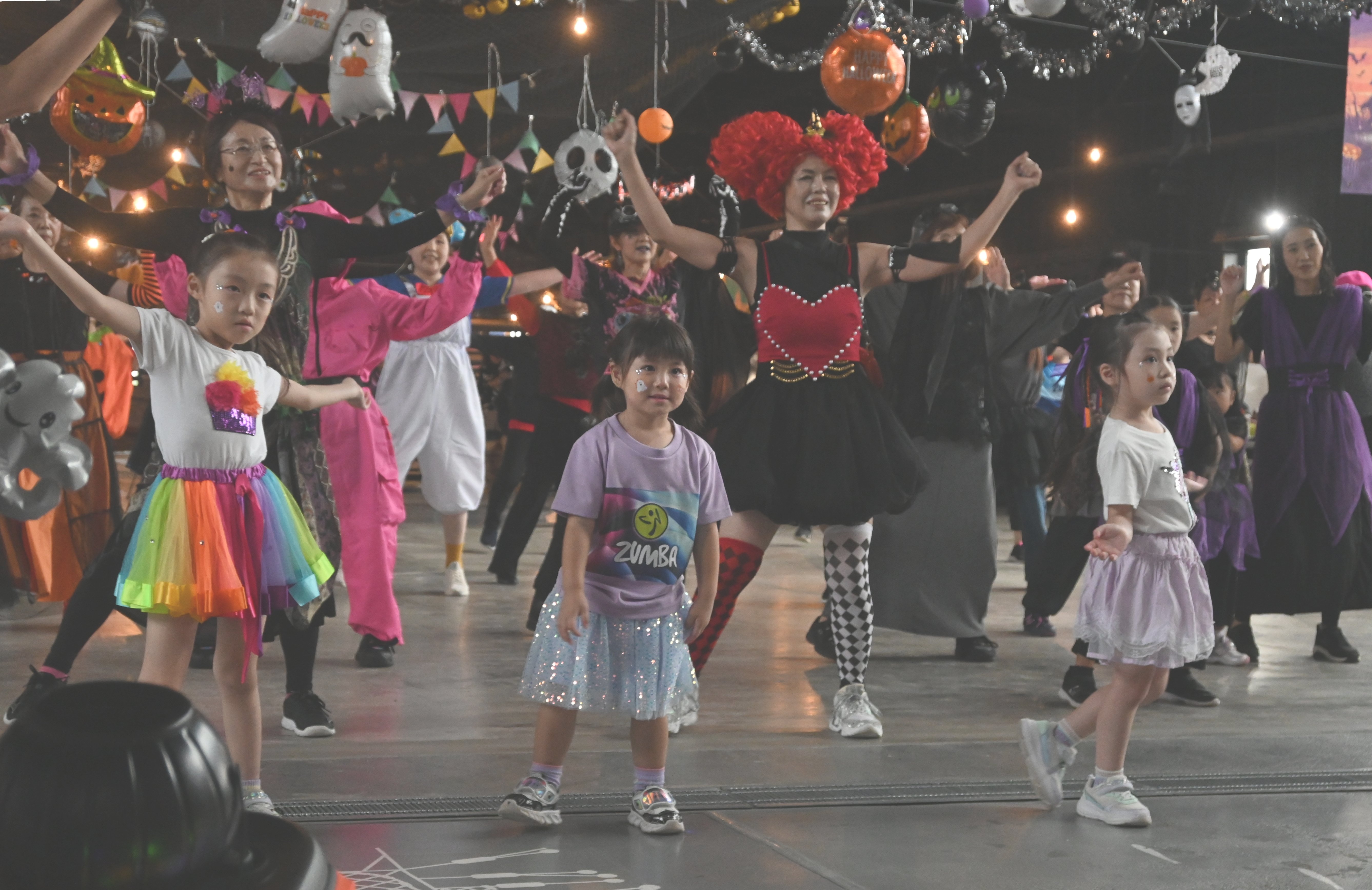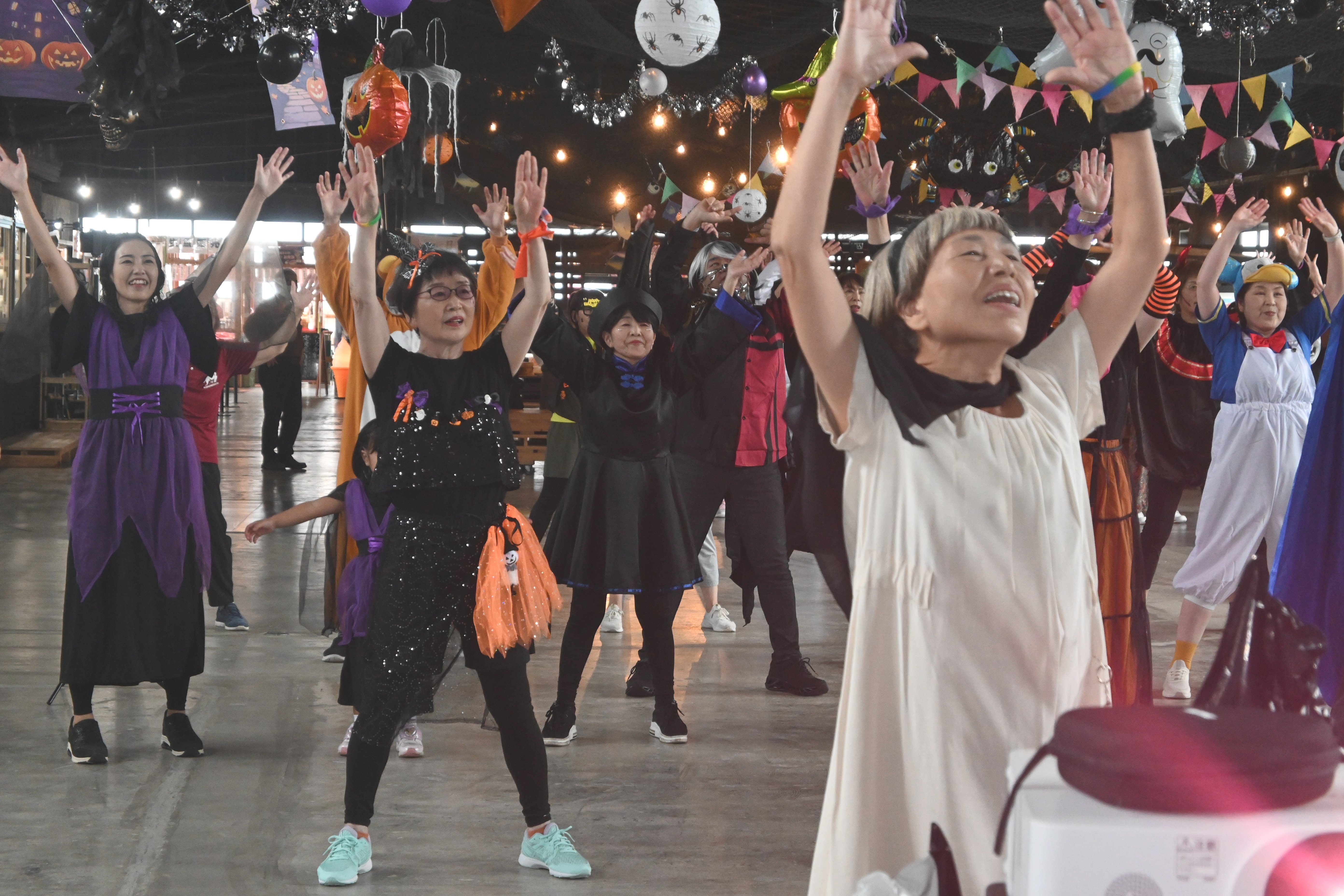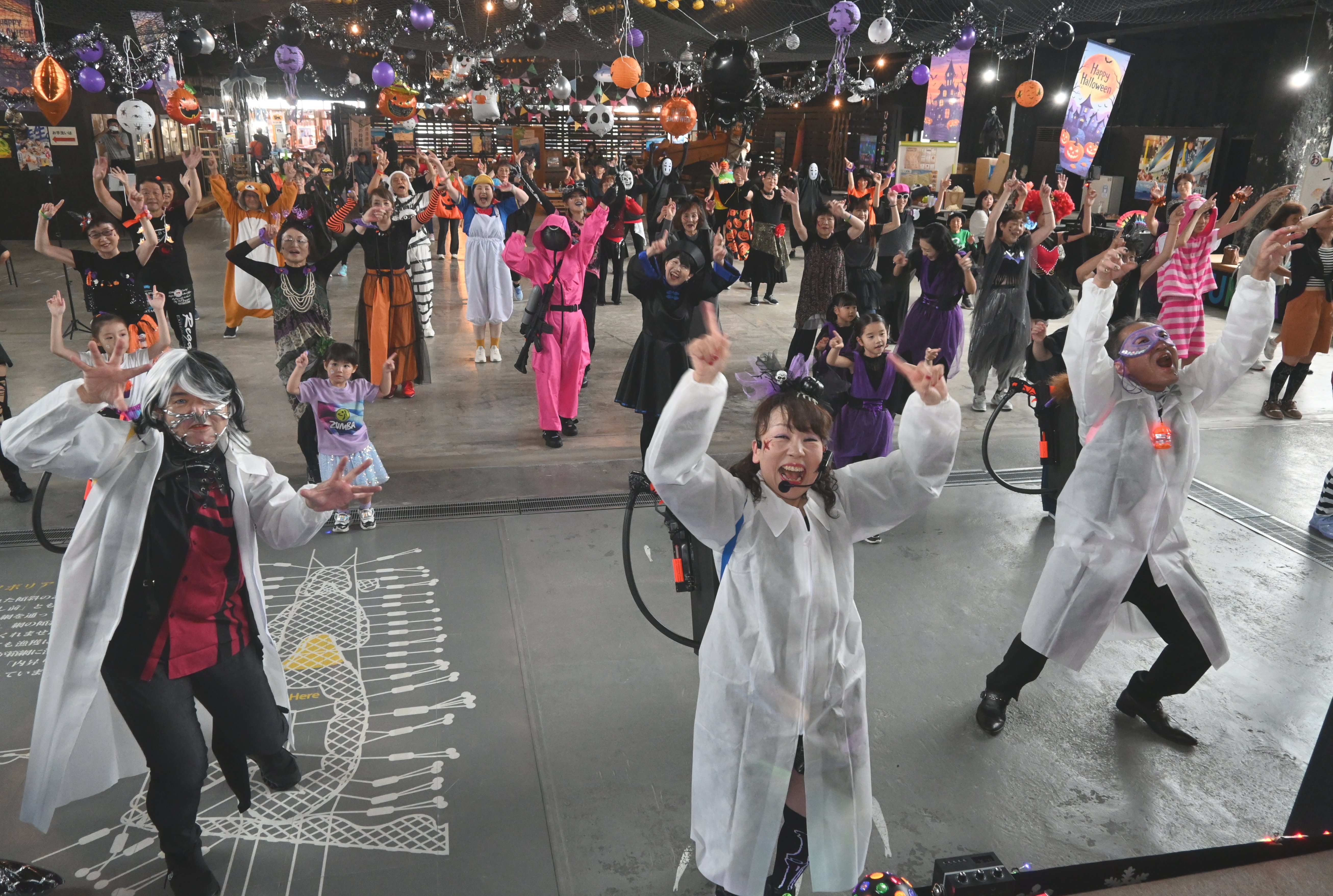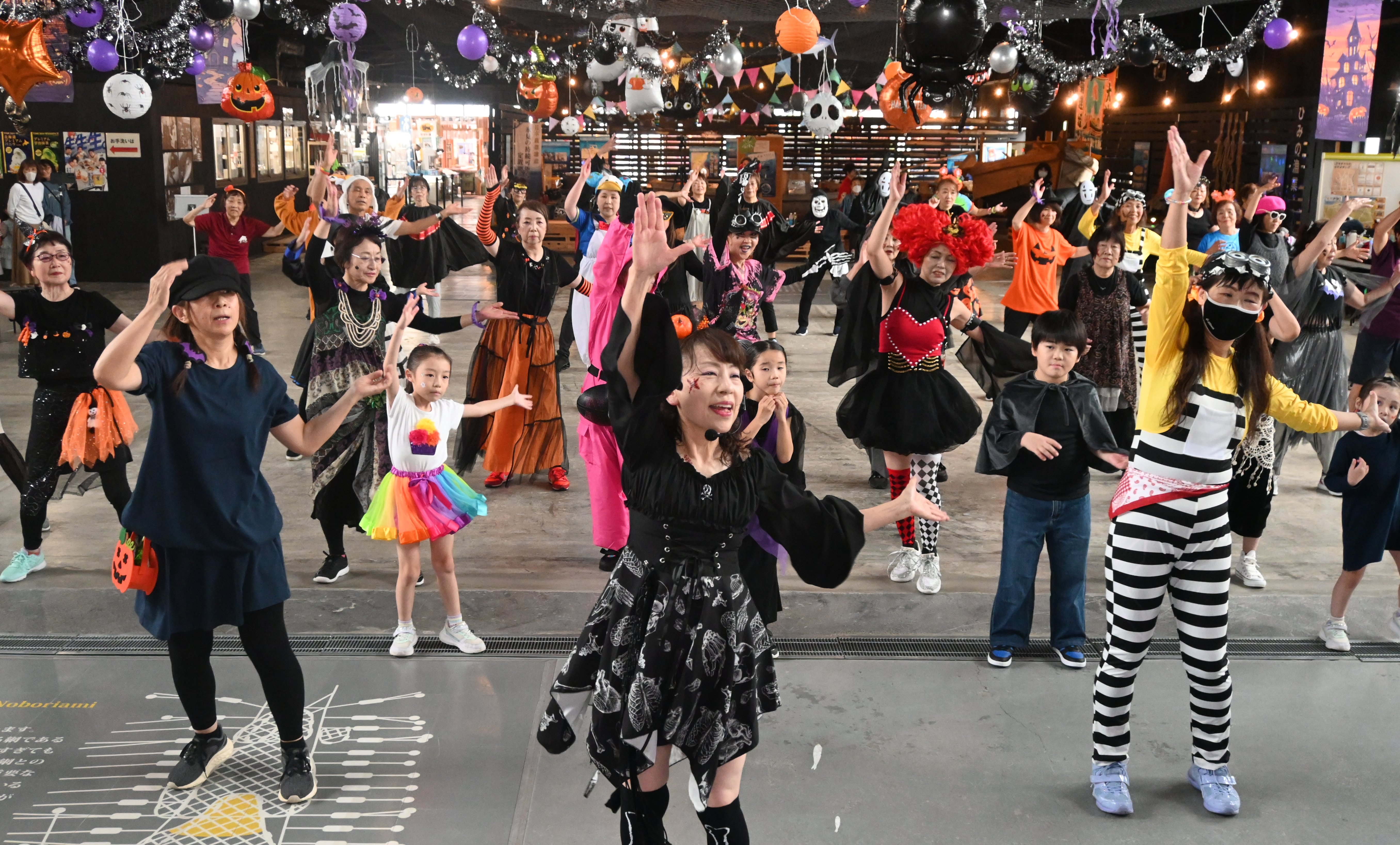 参加者は、映画「ゴーストバスターズ」の主題歌やマイケル・ジャクソンさんの「スリラー」、adoさんの「唱」でゾンビのように踊ったり、往年のディスコサウンドに乗せて体を動かしたりして爽やかな汗を流した。天井に張られた漁の網にカボチャなどのハロウィーングッズを飾り付け、ムードを盛り上げた。