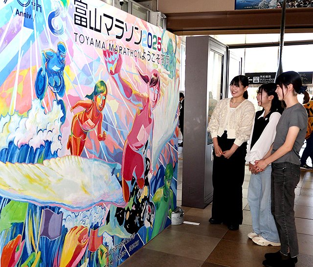 同マラソンは高岡市役所前をスタートする。パネルは縦2・1メートル、横2・7メートルで、富山大芸術文化学部3年生で絵画を専攻している荒木祐穂さんと江上結子さん、高杉麻結さんがデザインを担当。ライチョウに乗りゴールを目指すランナーを中央に描き、高岡大仏や富山湾の波などを配置した。