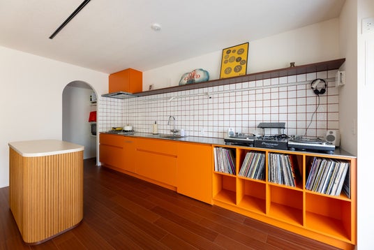 キッチンの延長線上に固定型のDJブースを設置。移動式カウンターを組み合わせることで作業スペースとしても活用でき、家族と過ごすリビングの中で趣味を楽しめます。