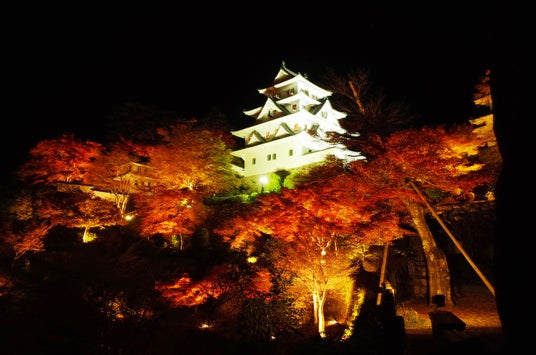 郡上八幡城郡上八幡城は、天正8年(1580)に築かれた山城で、現在の天守は昭和8年に木造で再建された「日本最古の木造再建城」として知られます。城山からは城下町や吉田川を一望でき、四季折々の景観が楽しめます。特に秋の紅葉シーズンには見頃を迎えると、真紅に染まる山に包まれた天守の姿は、まるで炎に包まれたかのような「天守炎上」と称される圧巻の絶景を誇ります。