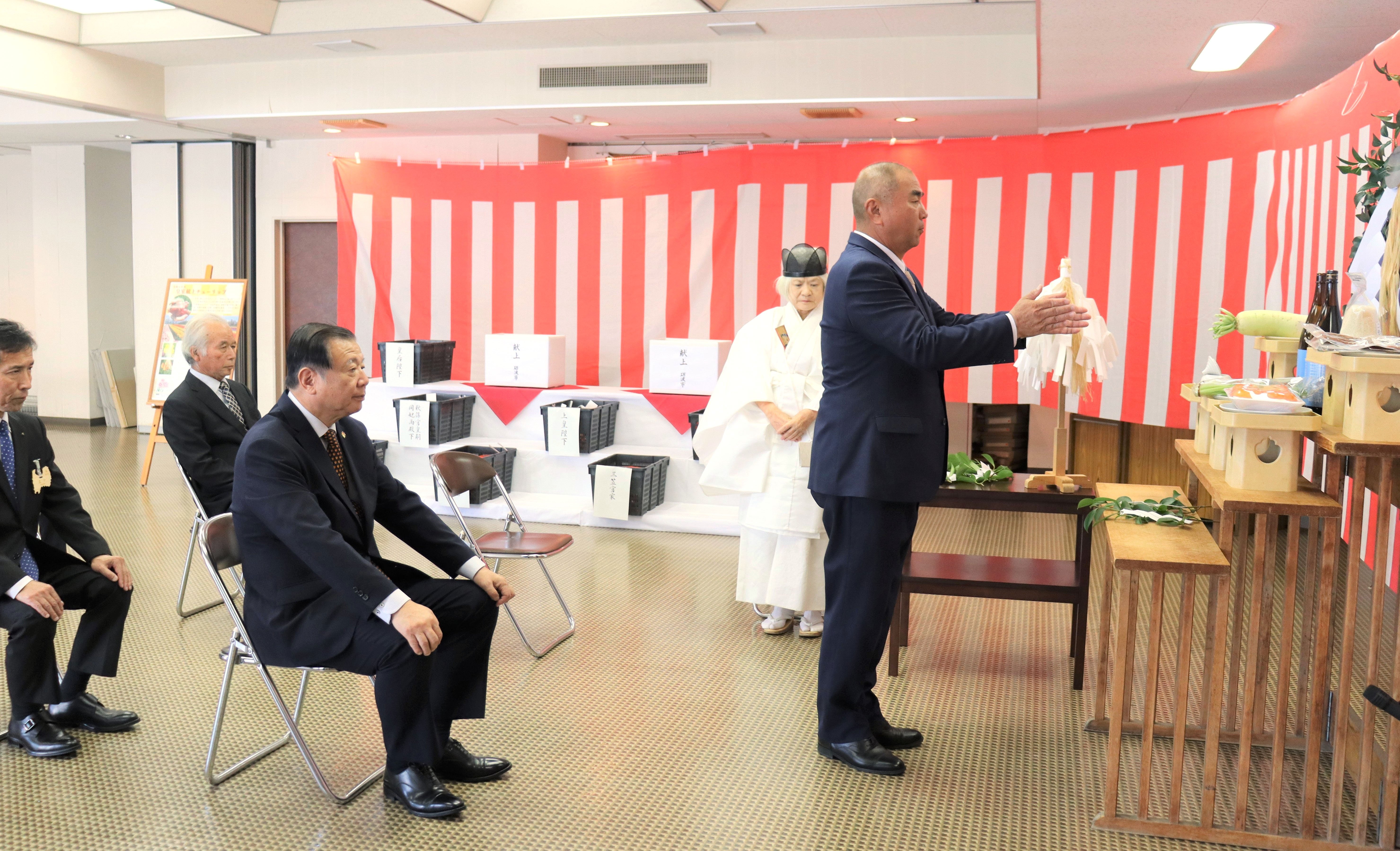 球根の献上は、1954年から毎年行っている。式に先立ち、球根収穫感謝祭の神事が執り行われ、石田組合長らが今年の収穫に感謝した。石田組合長は「生産量は数年続けて激減しているが、維持、拡大できるよう頑張っていきたい」と述べた。