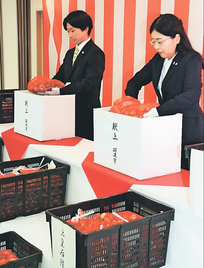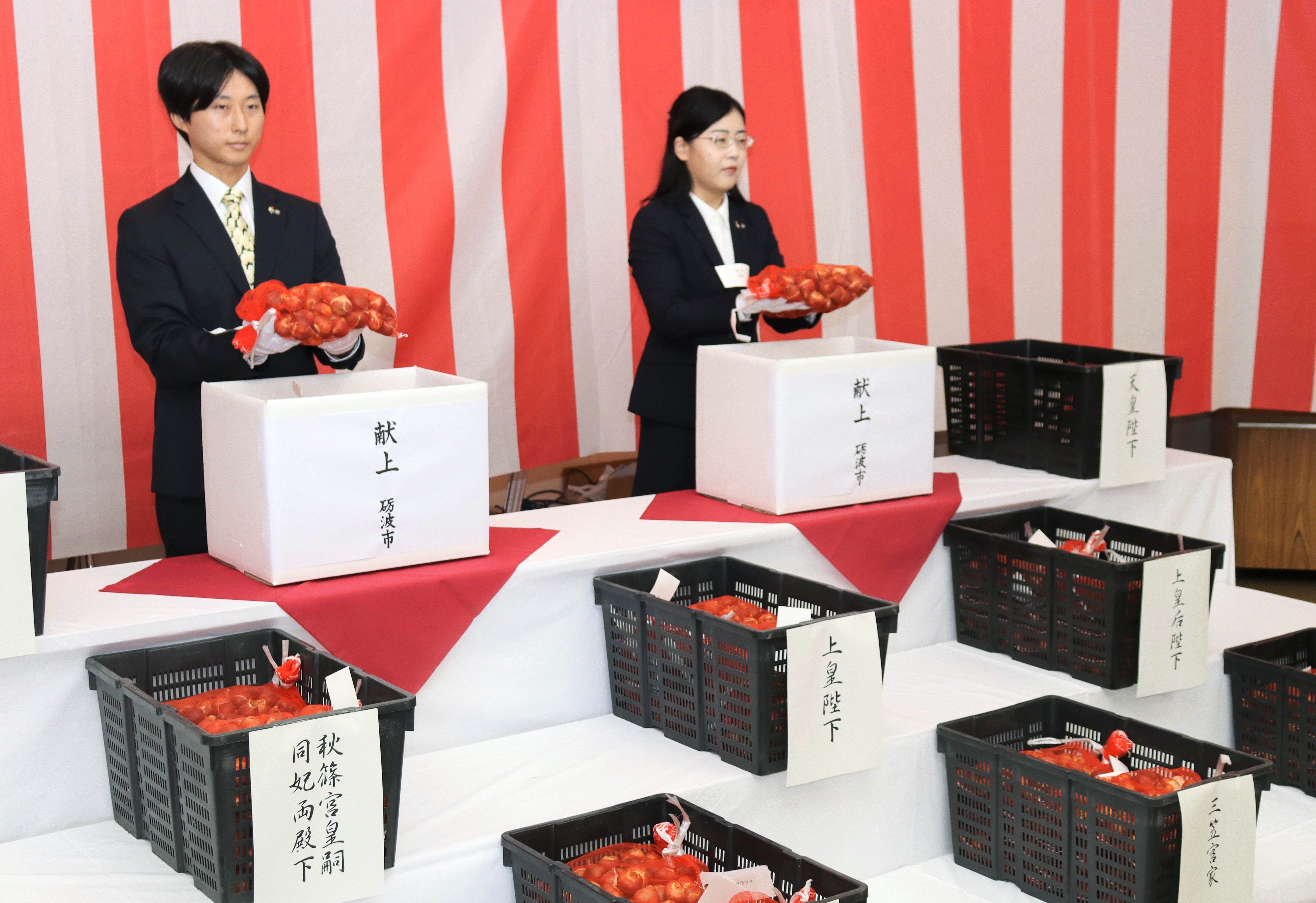 砺波市は7日、同市大門の県花卉(かき)球根農業協同組合で、皇室に献上する富山県産球根の箱詰式を行った。6品種の計4500個を天皇、皇后両陛下や宮家に贈る。