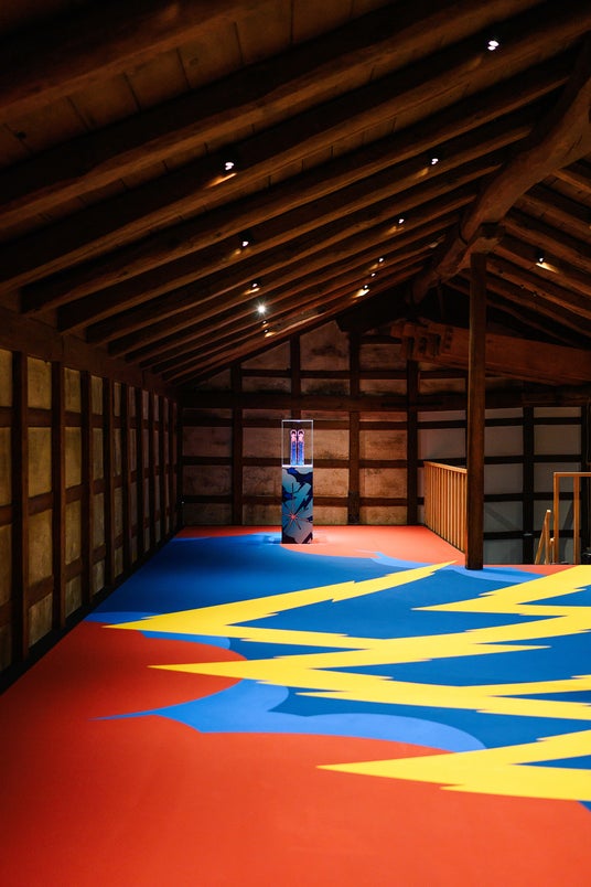 室町時代から続く「越中八尾和紙」。現在の八尾和紙の特徴でもある「型染め」は、大正末期から昭和期にかけて柳宗悦によって提唱された「民藝運動」に起因して、西欧の近代文化の陰で失われていく民衆の文化にかけがえのない美を見出し残していこうという思いとともに重要無形文化財(人間国宝)「型絵染」保持者の芹沢銈介を中心に作り上げられた歴史があります。そのような文化的背景を重ね合わせると、東京藝術大学・染織専攻出身の舘鼻則孝ならではの視点が込められた作品とも言えるでしょう。
