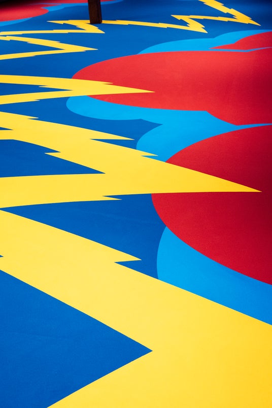 大正元年(1912年)に建てられ、112年の歳月を経ている桝田酒造店・酒造場の床面に描かれた本作は、空間の奥に位置する神棚から稲妻が波打つように前方へ伸びています。その稲妻は、桝田酒造店のシンボルでもある「龍」を隠喩するもので、先端が三方に分かれるその姿は「龍爪(りゅうそう)」を表現しています。また、酒造りの原料でもある「米」と「稲妻」は縁が深いものでもあり、豊穣への願いが込められた絵図でもあります。