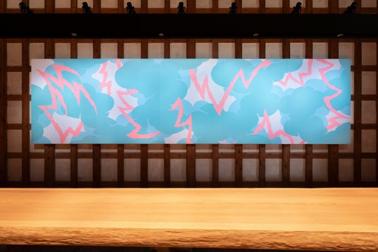 《Descending Painting》は、「稲妻」と「雲」が象徴的に描かれた舘鼻則孝の代表的な絵画作品シリーズです。本作は、仏教において臨終を迎える際に阿弥陀如来と菩薩が雲に乗り迎えに現れる場面を描いた「来迎図(らいごうず)」に着想を得て制作されたものです。また、中心に描かれる稲妻は神道における依代に「神のみたまが依り憑く」場面をモチーフとして表しています。先述したような主題から「天と地」や「生と死」などを一対の要素として描くことで、仏教と神道における双方の価値観が共存する「神仏習合」と呼ばれる習合思想が作中に表現されています。