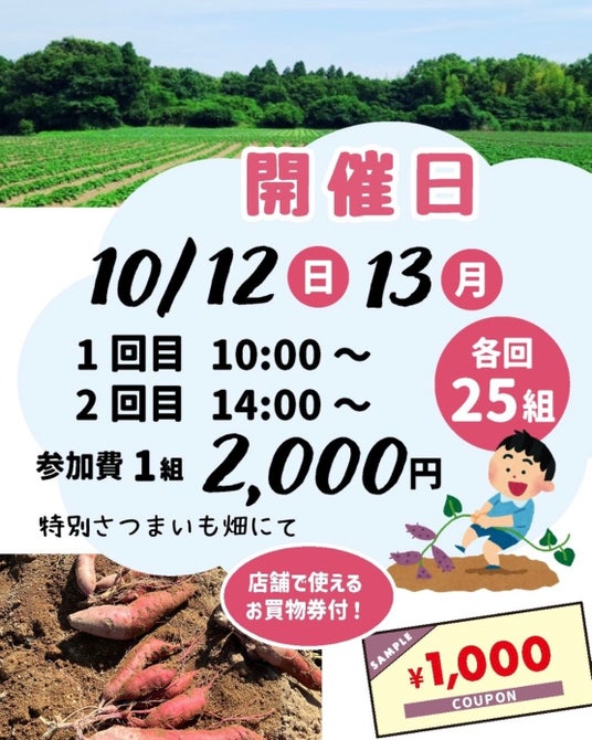 道の駅「蓮如の里あわら」(福井県あわら市)では、秋の恒例イベント「さつまいも収穫体験」を2025年10月12日(日)・13日(月・祝)の2日間開催いたします。土の中からごろごろと顔を出すさつまいもを掘り起こす体験は、子どもから大人まで大人気!掘ったあとのお芋はそのままお持ち帰りいただけます。