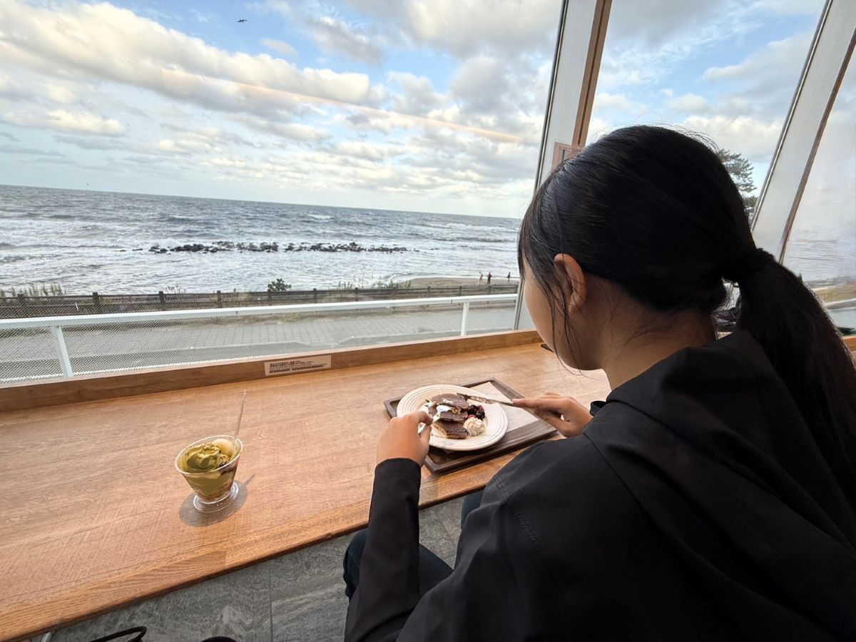 目的地は雨晴海岸の道の駅でしたが、強風で海岸には降りれず、日本海の荒波を見ながら、娘はホットケーキを食べてご満悦。