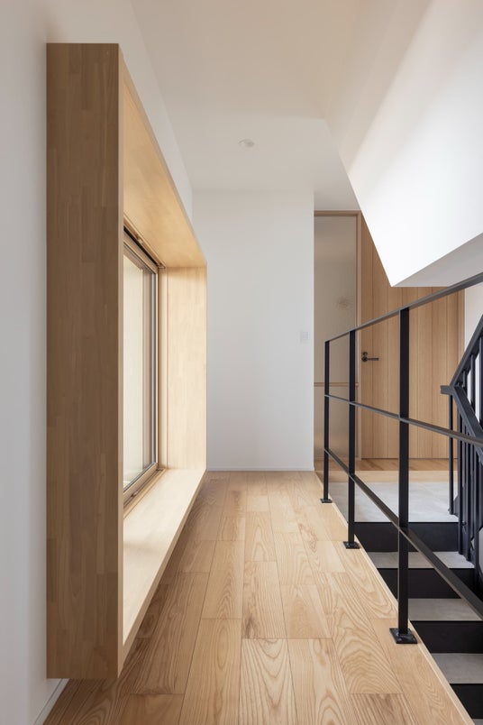 2階ホールへ上がる階段は、既存の壁を撤去してアイアン手すりを設置。手すりの向こうに見えるバルコニーの窓枠が印象的で、ピクチャーウィンドウのような抜け感を演出しています。