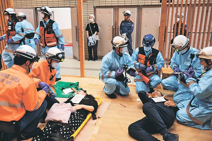 同センターでのイベント中に刃物を持った男が来場者を襲い、多くのけが人が出たことを想定。救急隊員や消防署員らが次々に到着し、重症度に応じて治療の優先順位を決める「トリアージ」や、応急処置などを迅速にこなした。
