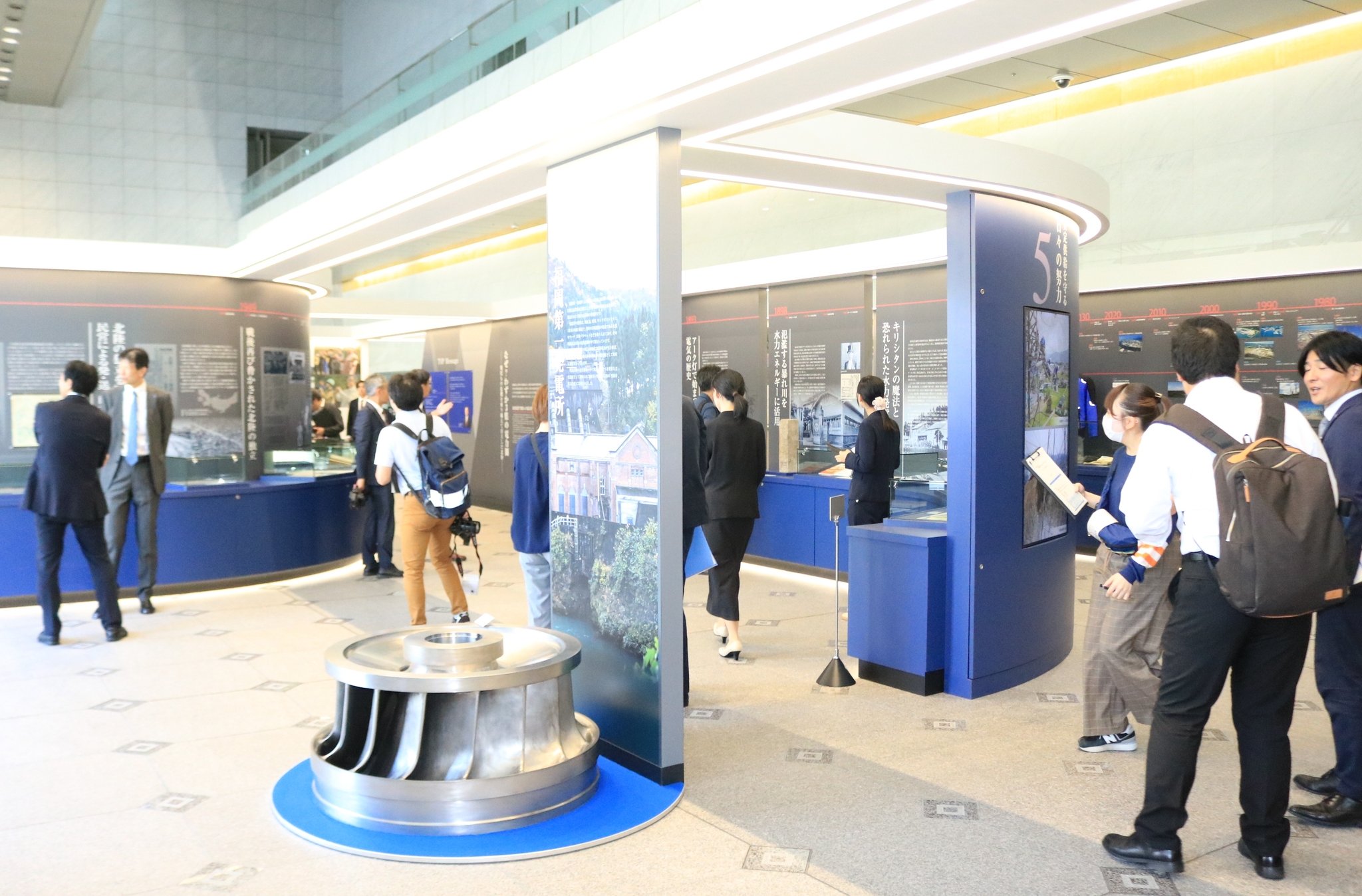 ギャラリーは、西側ロビーの200平方メートル程度のスペースに設けた。戦後の電気事業再編成で北陸ブロックが「独立」した経緯について、地元経済界が連合国軍総司令部(GHQ)の案に反対した陳情書などを展示。1956年に本格着手した常願寺川水系の有峰開発は、社に残る写真や図面などを並べ、社運を懸けた一大プロジェクトであったことを紹介した。近年の脱炭素の取り組みの解説パネルも置いた。