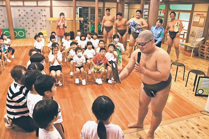 防犯の基本を楽しく伝えようと、同署が相撲部に協力を依頼した。年中、年長児57人が参加。不審者への対応を学ぶ訓練では、部員から「お菓子をあげるからおいで」「写真を撮ってあげる」などと声をかけられると「嫌だ」とはっきりと断って逃げた。