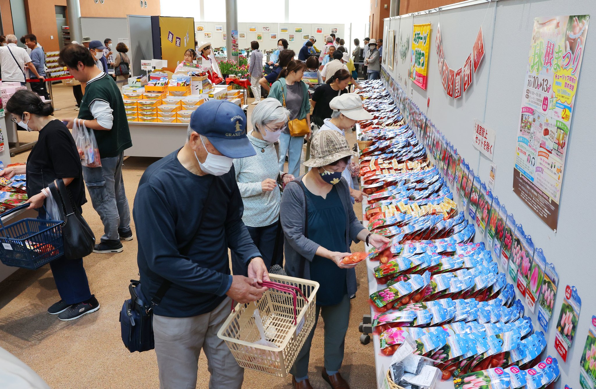 150品種10万球が用意された。県育成品種では昨年発表のピンクのユリ咲き「春のワルツ」や、定番の「黄小町」などが並んだ。生産者の顔写真を添え、「丹精込めてつくりました」「よりよい球根を届けるために頑張ります」といったメッセージが掲示された。生産者が育成した品種では白の一重咲き「白鷹」や、ユリ咲き「真鶴」が初登場した。