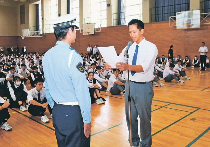 県警が10日に同校で行った指定式では、生徒会長の森田橙満(とうま)さん(2年)が井上数也県警交通部長から指定書を受け取った。風紀委員長の斎藤樹之(じゅ の)さん(3年)が「ヘルメットを着用します」「ながら運転はしません」などと宣言した。
