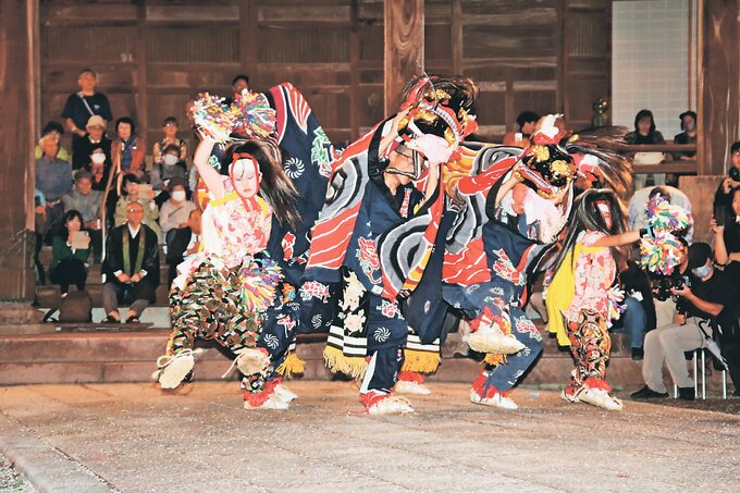 ちょうちんとかがり火がともった本堂前に、各団体が山門から登場。太鼓と笛の音色に合わせ、獅子取りを担う子どもの愛らしい舞や迫力ある獅子舞を多彩に演じた。2頭の獅子による息の合った「夫婦(めおと)獅子」や天狗と獅子が壮絶な戦いを繰り広げる「獅子殺し」もあり、会場を沸かせた。