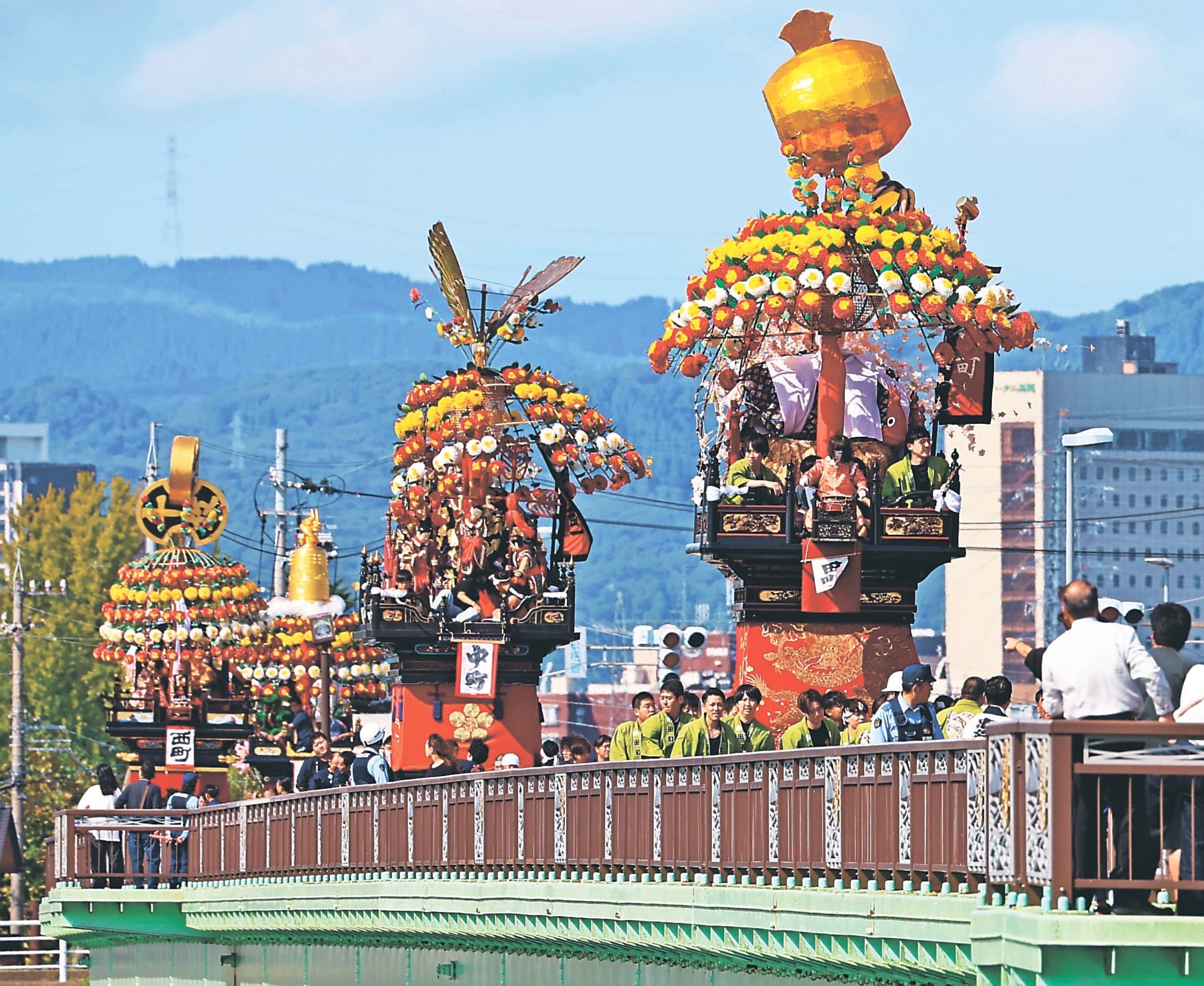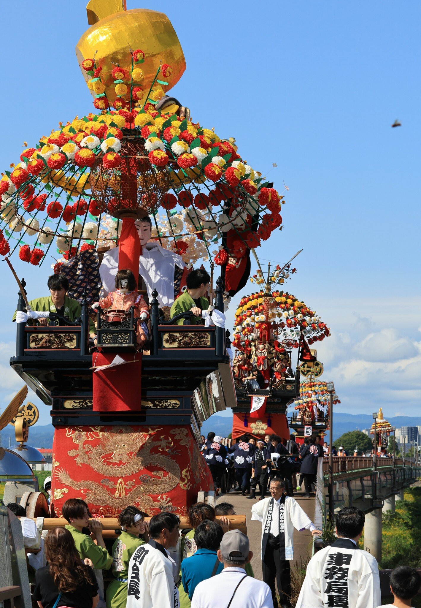 大門曳山(ひきやま)まつりは12日、富山県射水市大門地域で行われた。華やかな4基の山車が車輪をきしませながら街中を巡行。大門大橋を行き来する見どころ「橋渡し」が秋晴れの空に映え、大勢の市民らがカメラやスマートフォンを手に見学した。