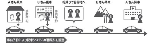 1台のタクシーを複数の利用者が相乗りするサービスで、配車アプリ(以下、「NearMe(ニアミー)※1」という。)または電話で事前予約を受け、目的地の方向や乗車時間帯が近い利用者同士を調整し、効率的な運行でそれぞれの目的地まで送迎します。相乗りがない場合は1組でも運行します。
