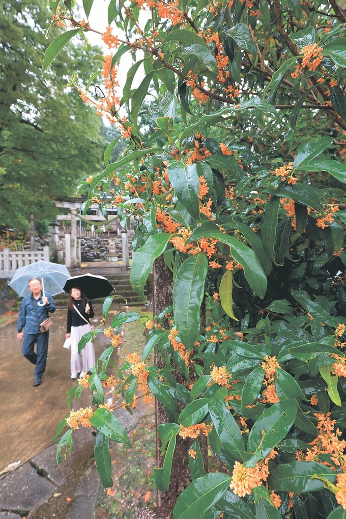 坂の町に秋の香り 富山・八尾 2025年10月14日 05:00 社会・話題 見頃を迎え、甘い香りを漂わせるキンモクセイ=諏訪神社 富山市八尾町諏訪町の諏訪神社で、キンモクセイが見頃を迎え、オレンジ色の小さな花を密集させて咲かせている。13日は雨が降る中、独特の甘い香りを周囲に漂わせ、坂の町に秋の深まりを告げていた。 諏訪神社は「日本の道百選」に選ばれている石畳の通りに面している。香りに誘われた観光客らが境内を訪れ、秋の風情を楽しんだ。 この機能は会員限定です。 お気に入りの記事を保存し、マイページで読むことができます。 ログイン 会員登録はこちら