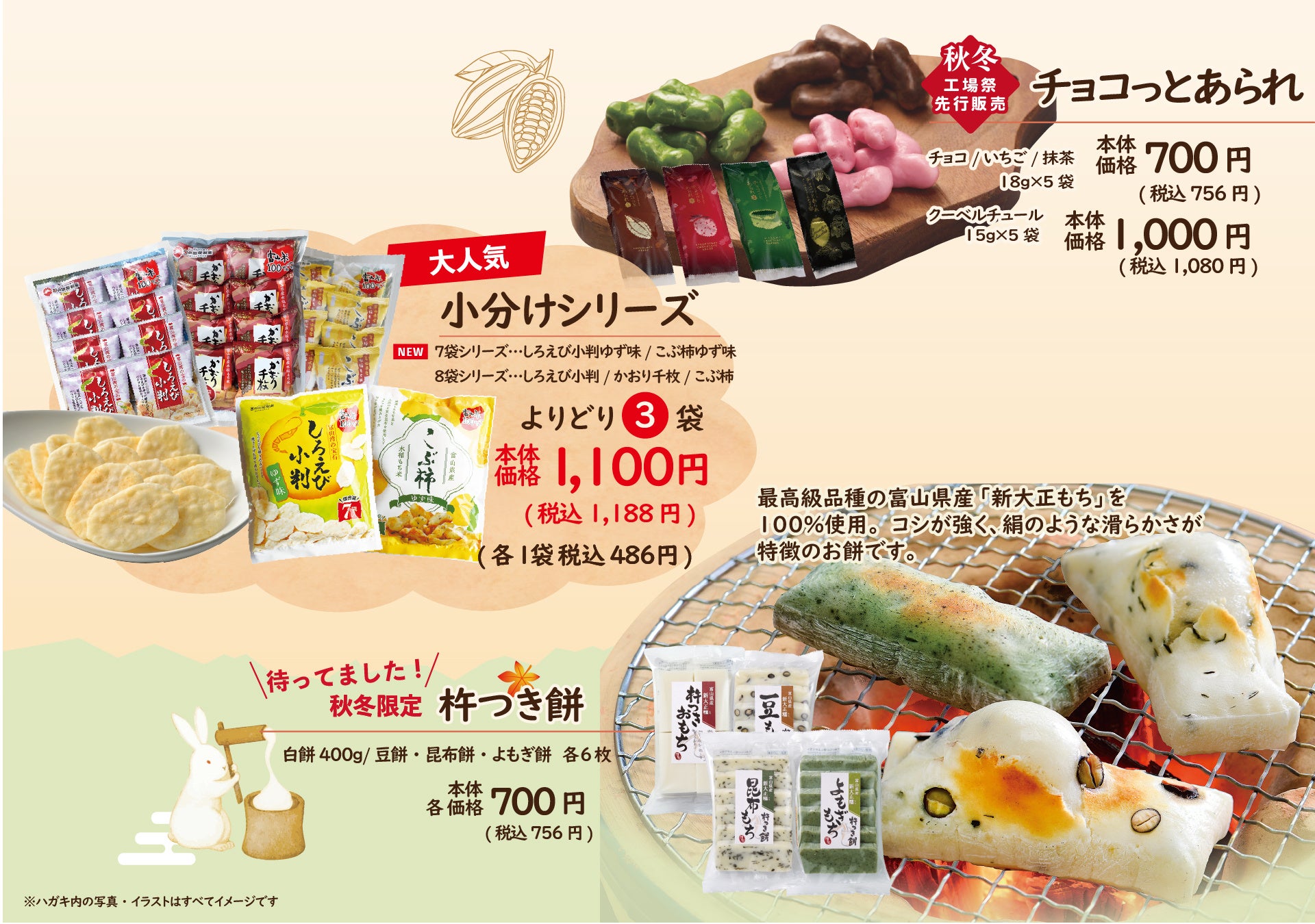 「よりどり3袋企画」では工場祭限定商品の7袋入りの「しろえび小判ゆず味」「こぶ柿ゆず味」が追加され、5品からお選びできます。秋冬の人気商品「チョコっとあられ」「杵つき餅」もご用意しています!