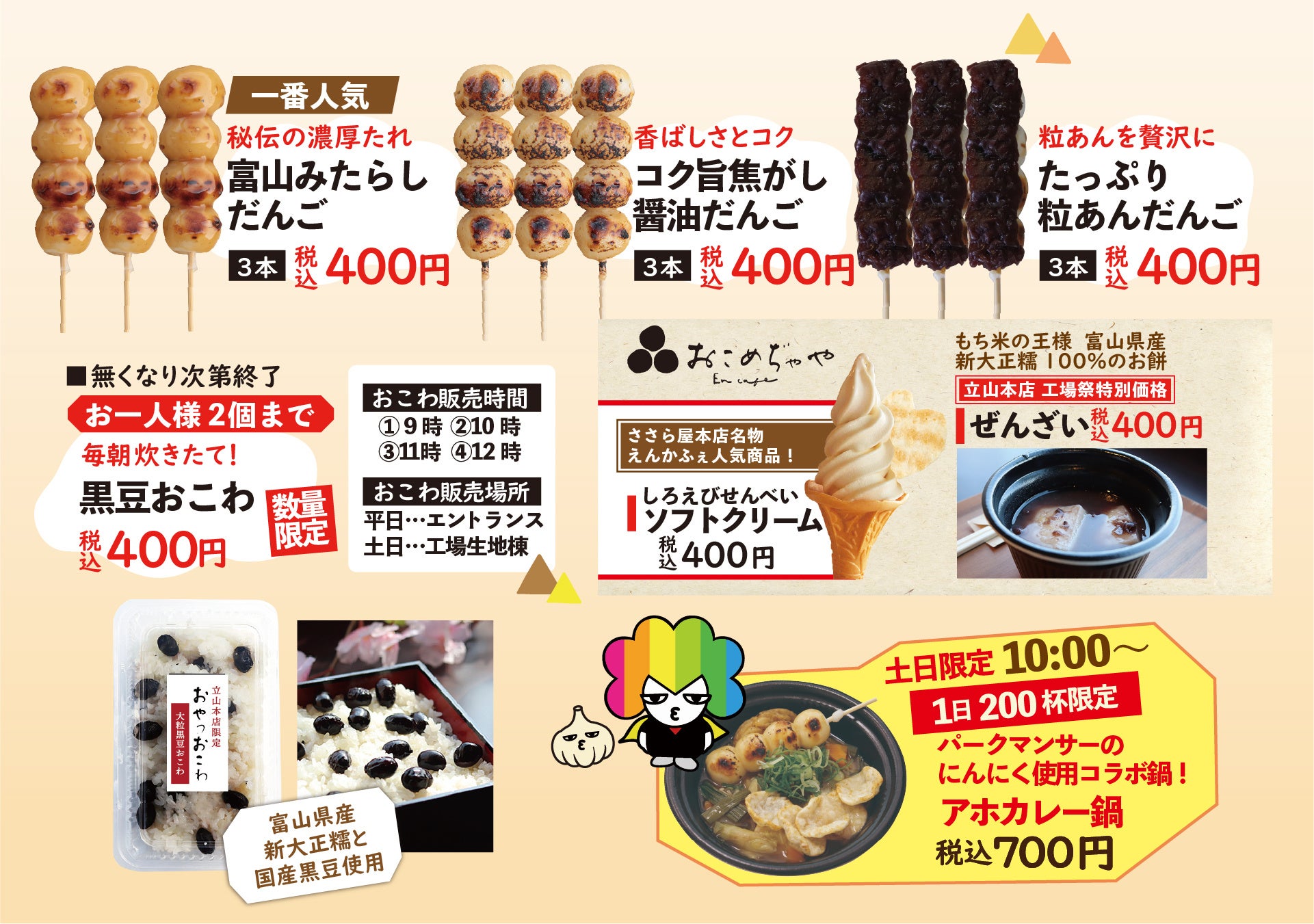 立山工場祭名物!行列のできる特別価格のだんご3種・黒豆おこわ・カフェメニュー販売、週末限定の富山うんまいもん市も開催