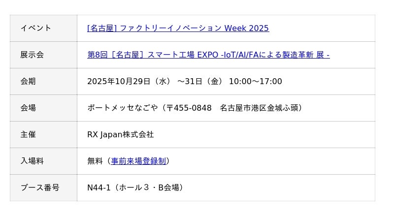 株式会社テクノア(本社:岐阜県岐阜市、代表取締役:山崎 耕治)は、10月29日~31日に ポートメッセなごや で開催される「[名古屋] ファクトリーイノベーション Week 2025」に出展いたします。