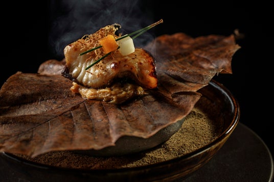 初冬にかけて旬を迎え、脂に甘みとコクが増す黒むつを幽庵地に漬け、炭火でじっくりと焼き上げた一品です。この幽庵焼きに、吟醸味噌を塗った朴葉を添えて温めた石の上で提供することで、濃厚な旨みがありながらも幽庵地の清涼感と吟醸味噌の香ばしさが融合した軽やかな味わいを楽しめます。さらに、絹生姜のほのかな風味がアクセントとなり、味わいに深みをもたせます。