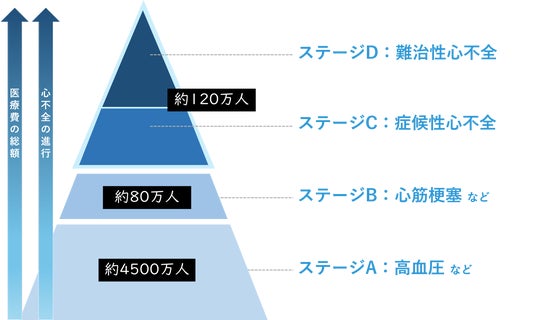 心不全は、全世界でその罹患者数が増加しており、「心不全パンデミック」とも呼ばれている重要な国民病です。個人の健康や医療現場に及ぼす影響に限らず、介護を含む医療費を逼迫することも指摘されています。