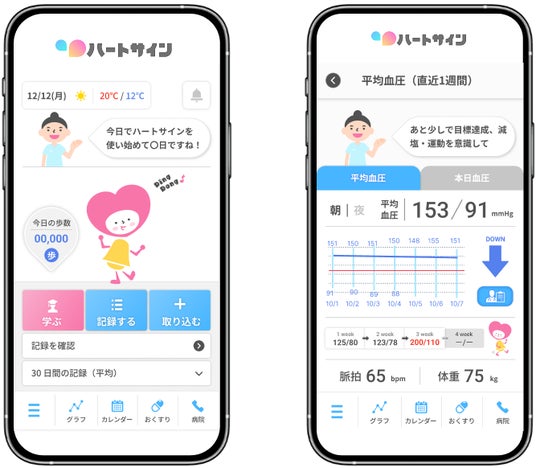 ハートサインの基本機能である血圧や脈拍数、体重等の入力測定値と自覚症状に応じて自動的にリスクを判定し受診を促す機能を用いて、心不全症状の見逃しによる再発や緊急入院のリスク軽減を目指してきました。これらのデータは医療者で確認され、外来診療やリハビリテーション、療養指導等に活用されることで質の高い診療支援を提供することも目的としています。そして今回、生活習慣病の代表格であり、心疾患・心不全の主要なリスク因子である「高血圧」の管理ニーズに応えるべく、対象患者層を拡大し、さらなる社会実装を目指してアプリを大幅にリニューアルいたしました。