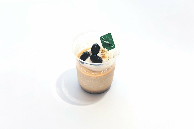 滑らかな口当たりのプリンに、南砺市産の丹波黒豆大豆の煮豆を添えた。きな粉のソースで香ばしさにアクセントを加えた。(提供日=25日)