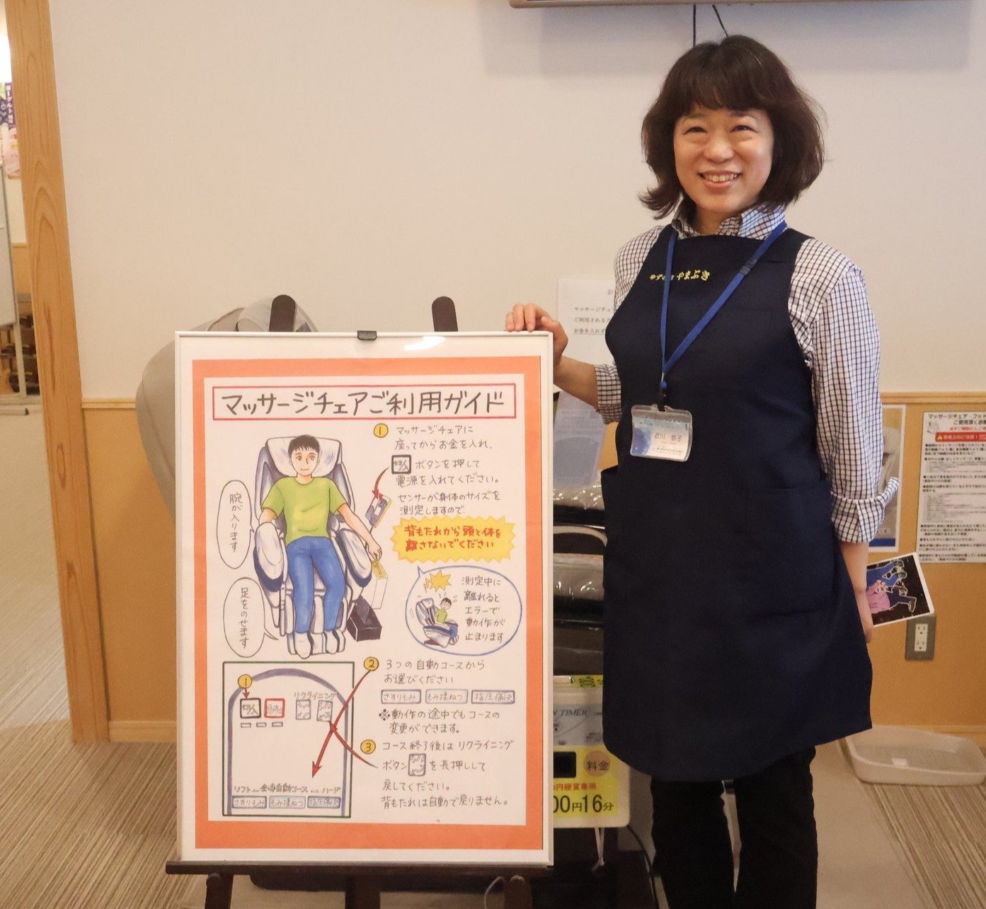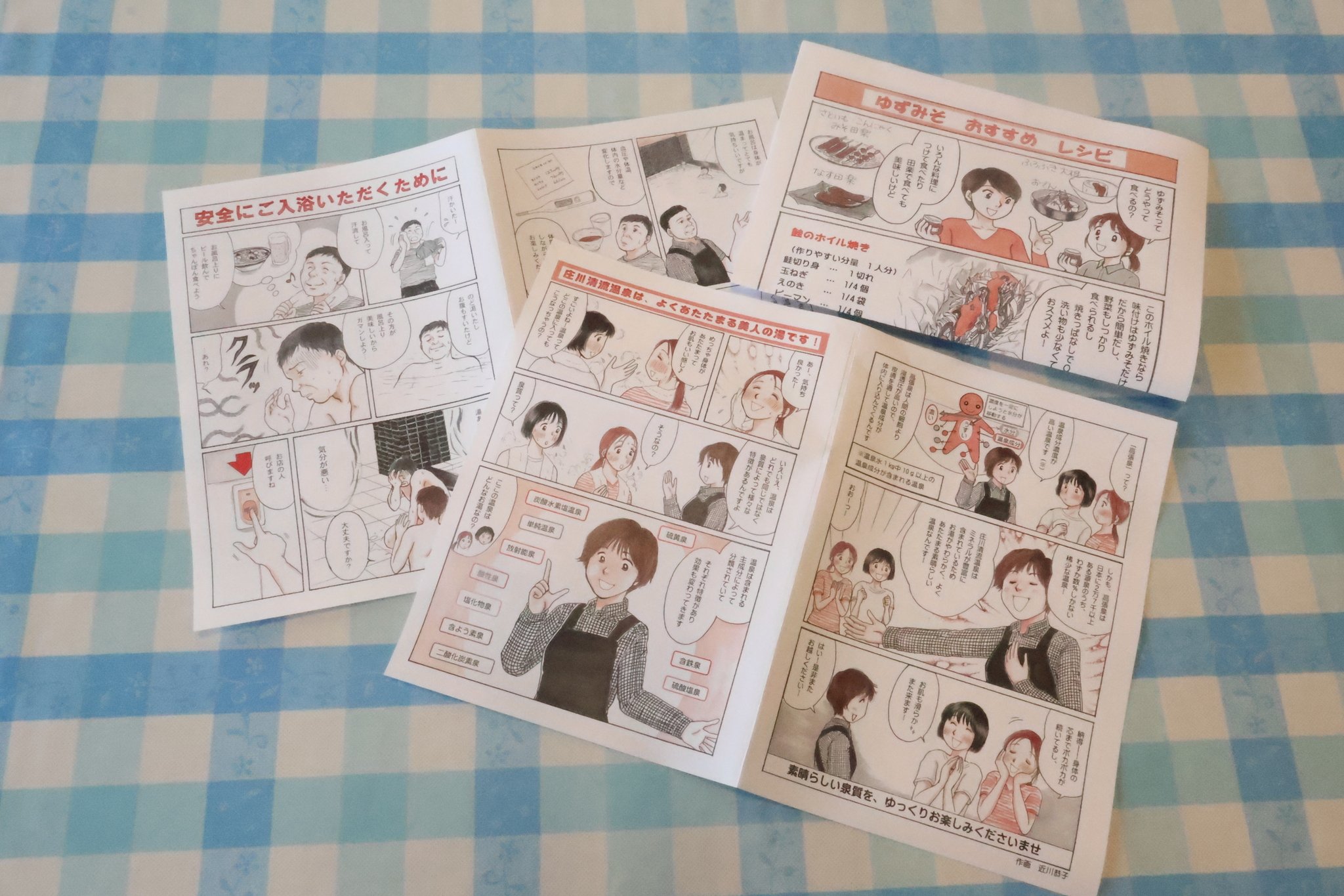 ゆずの郷やまぶき(砺波市庄川町庄)を訪れると、お菓子や土産品がある入り口近くのコーナーに、施設を漫画で紹介するチラシが置いてあった。館内を見渡すと、漫画やイラストで描かれたポスターがあちこちに。これらの漫画は2017年のリニューアルオープン時から働く近川恭子さん(51)の作品だという。