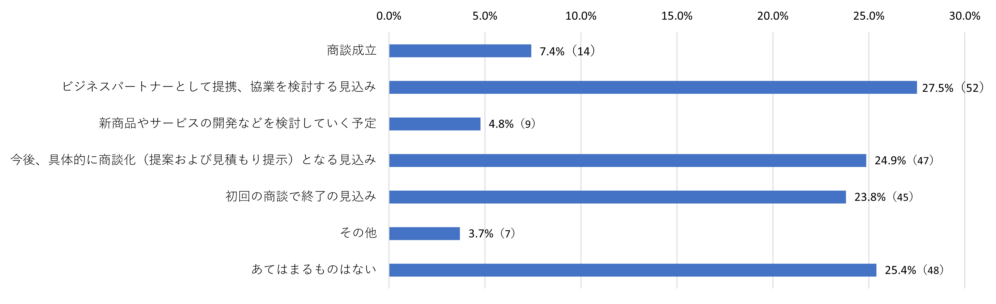 商談の感触や今後の見込みについては、「商談成立」が7.4%、「具体的な商談の見込みがある」が24.9%、「ビジネスパートナーとして提携・協業を検討する」が27.5%、「商品・サービス開発を検討していく予定」が4.8%となり、新たなビジネスチャンスのきっかけとして本イベントが有効活用されていることがわかりました。