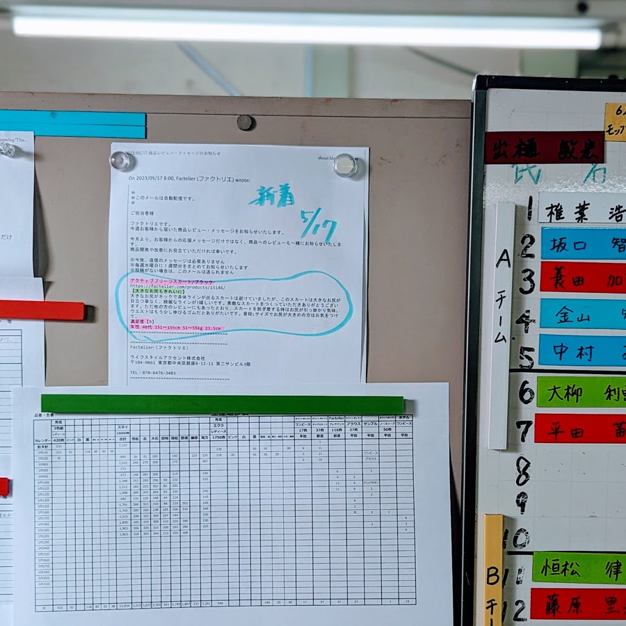 工場内の掲示板に貼られた、ファクトリエのお客様からの声