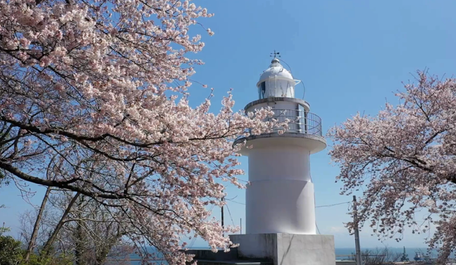 岩崎ノ鼻灯台は明治期に藤井能三が伏木港の発展を願い建設した伏木灯台に始まり戦後の昭和26年に鉄筋コンクリート造で完成しました。港の復興と船舶の安全を守る役割を果たし、地域の人々にとって町の誇りであり続けています。富山湾や立山連峰を望む桜の名所として知られています。