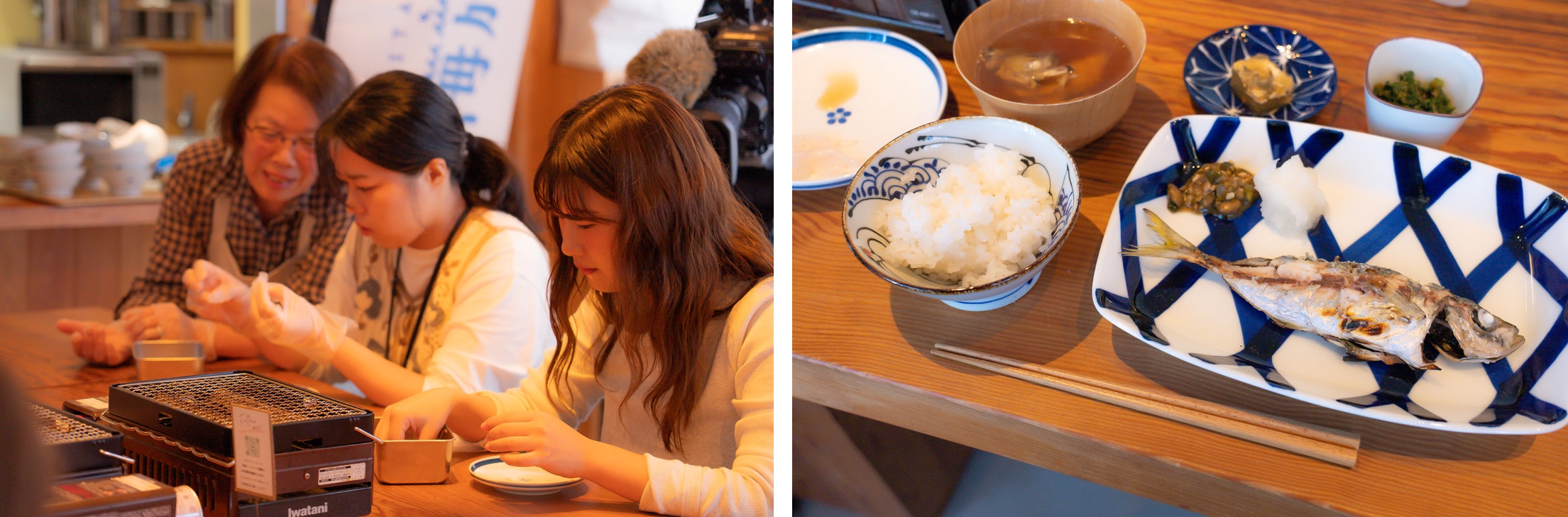 その後、漁港内にある鮮魚店「孫七」で朝採れの新鮮な魚を選び、シェアキッチン「みなとキッチン」で朝食作りを体験。漁師の野口さんのお母様が白えびの殻むきを教えてくださり、なんとも贅沢な白えびの刺身を堪能。自分たちで塩を振り、コンロで焼いたイシモチやアジはふっくらと新鮮な旨味が口の中で広がります。参加者からは、「採れたての食材は、食べ物じゃなくて生き物。ありがとうという気持ちで大切に食べようと思った」(大学4年生・女性・20代)「殻むきはとても繊細で難しかったが、甘くてびっくり!」(大学3年生・女性・20代)といった声が聞かれました。同キッチンで料理イベントも行っている「たべごと屋ナトゥーラ」さんが作ってくださる心づくしのお味噌汁やお惣菜も、心がほどけるおいしさ。射水で暮らす人々の温かさが感じられる、心あたたまる朝のひとときとなりました。