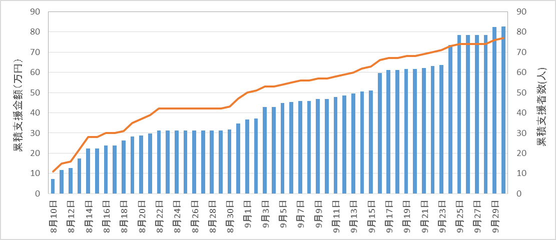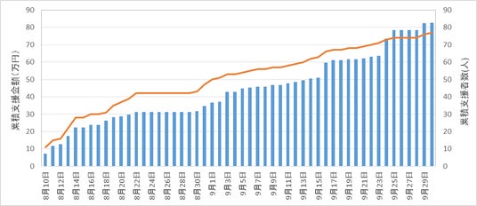 ▼支援募集期間を通じた支援金額(棒線)及び、支援者数(折れ線)