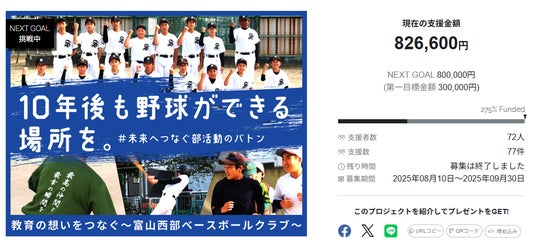 チーム・団体やアスリートを支援するスポーツ専門クラウドファンディングを展開するスポチュニティ株式会社(東京都中央区、以下スポチュニティ)は、富山西部ベースボールクラブ(富山市)のクラウドファンディングの支援募集プロジェクトを実施し、支援金額826,600円(目標達成率:275%)を達成して終了しました。