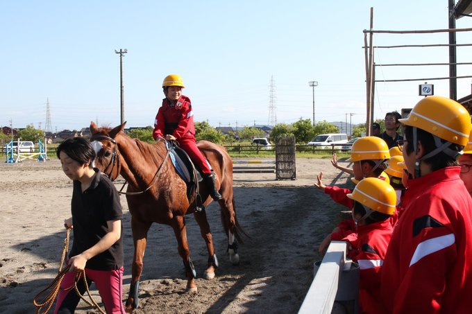 馬は雄のエンゼルとダブルアップの2頭で、祭りの神事「流鏑馬(やぶさめ)式」などで重要な役割を担っている。児童は1人ずつ馬に乗って馬場を一周。体を優しくなでたり、記念撮影をしたりした。