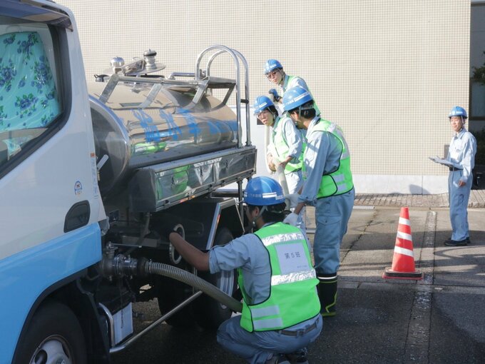 富山市上下水道局は17日、同市流杉浄水場で応急給水作業の技術コンテストを開いた。全体的な技術力や、チームワークの向上を目的とした初の試み。普段作業に従事しない職員を含む24人が、給水車の操作の正確性やスピードなどを競い、災害への対応力を高めた。