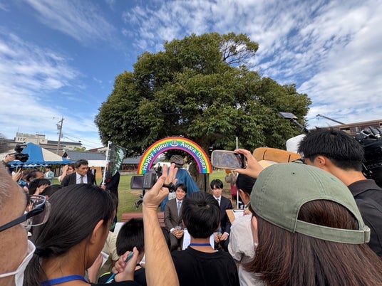 藤井聡太竜王と、佐々木勇気八段が、あわら温泉湯のまち広場で、地元の子どもたちの取材を受けました。