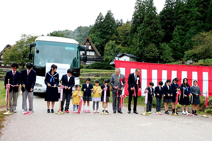 紅葉巡りバスは式典に合わせ、この日限定で相倉集落発着の計6便を運行した。第1便には住民が乗り込み、車窓から少しずつ色づき始めた木々を眺めながら、道谷までの計8キロの風景を満喫した。国内外から訪れた観光客も運賃100円で乗車した。