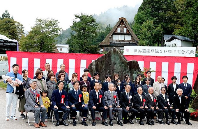 式典には住民ら約50人が出席。竹森高司区長が「住民が住む貴重な世界遺産を守っていくため、今後も皆さんの協力をお願いしたい」とあいさつし、松本謙一市教育長が「朝もやの中に合掌造りがある風景は、まさに日本の原風景だ」と祝辞を述べた。