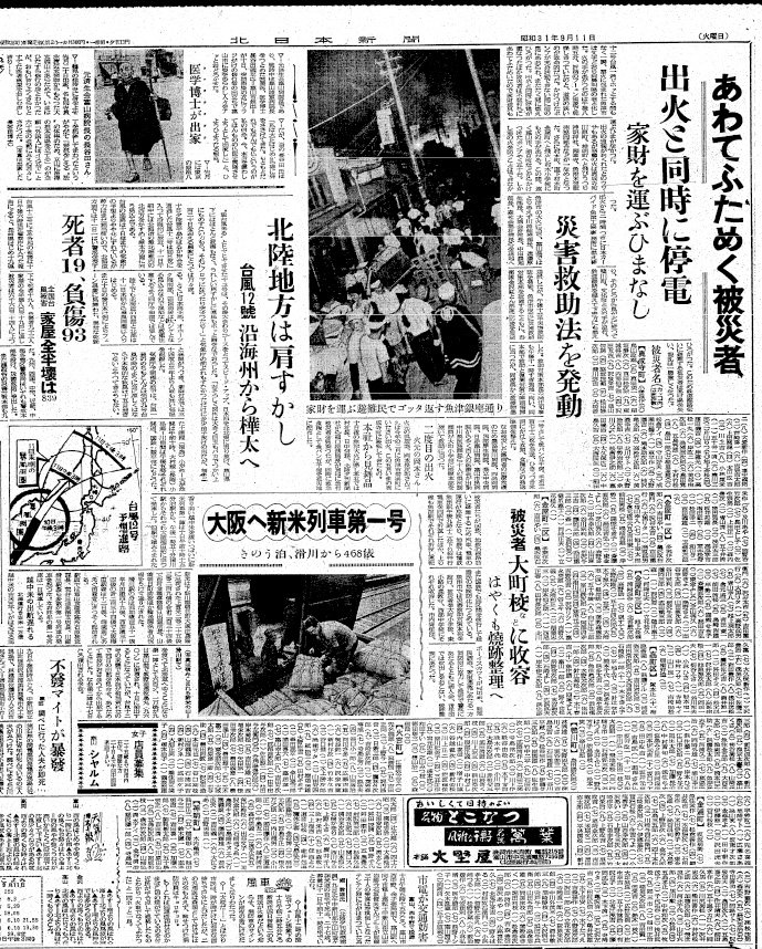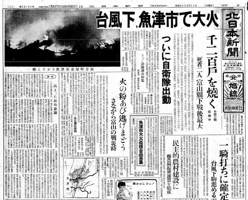 魚津市で発生した火災が台風の影響で拡大し、「1200戸を焼く」大火となった。「ついに自衛隊出動」「さながら富山の戦災時」という見出しから被害の大きさが伝わってくる。
