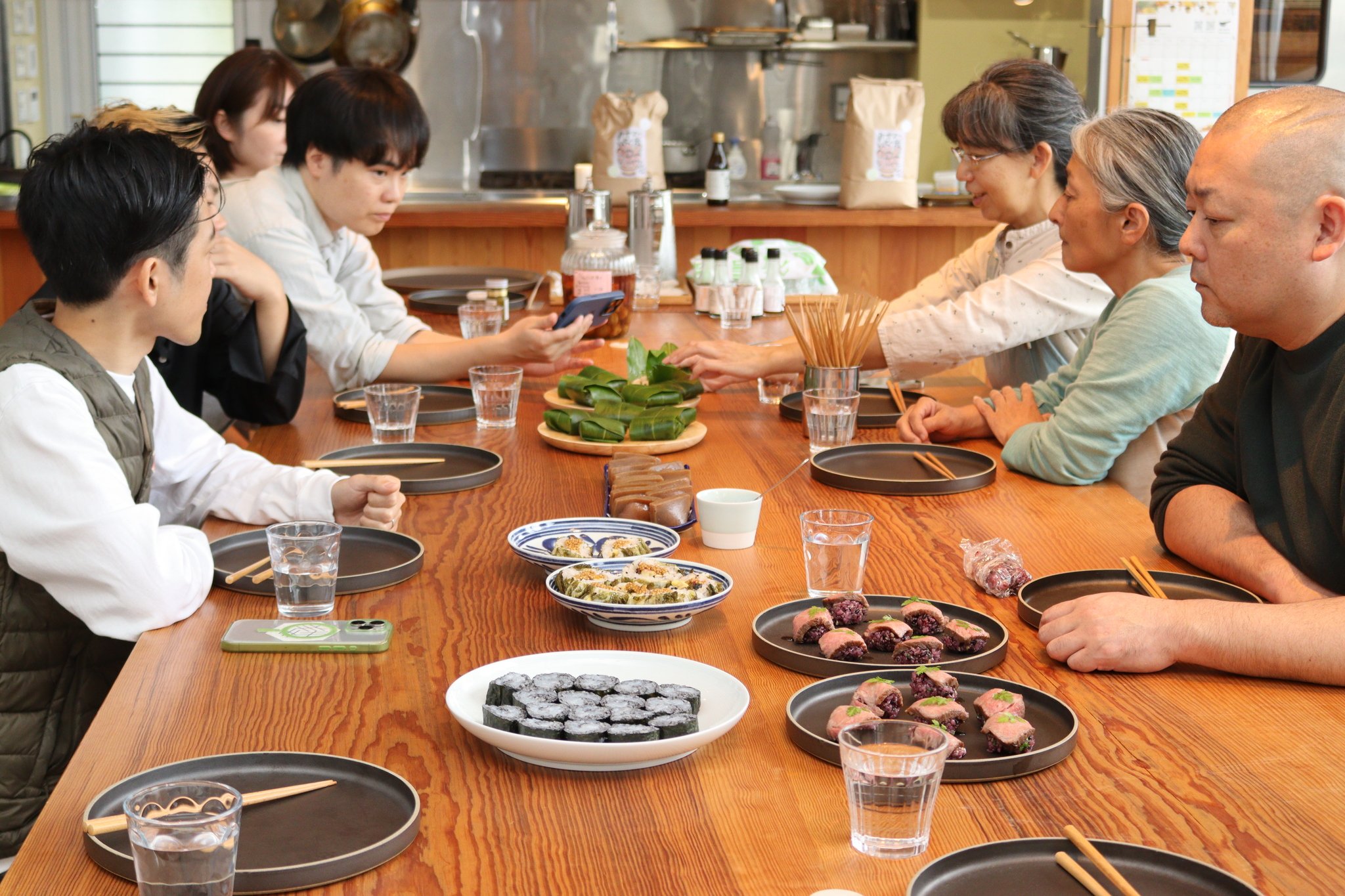 官民連携のまちづくり組織「一般社団法人しあわせデザイン」(富山市蓮町)が観光庁の事業採択を受けて企画し、県内のシェフ4組5人が参加した。朝どれのサゴシをササで包んだ蒸しずしや、郷土料理「あんばやし」を使ったビーガン(完全菜食主義者)も食べられるすしなどを作り、参加者同士で試食した。