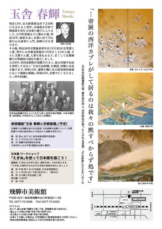 今回の展覧会の開催期間期間中に飛騨市美術館周辺では玉舎春輝にちなんだ関連イベントを開催します。美術講座「玉舎春輝と京都画壇」