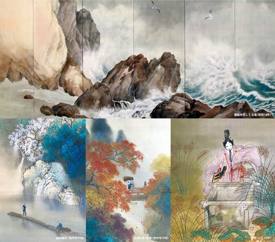 展示作品の一部(上:御製を拝して左隻、下左:嵐峡春色、下中:高尾紅葉・錦楓、下右:井筒)