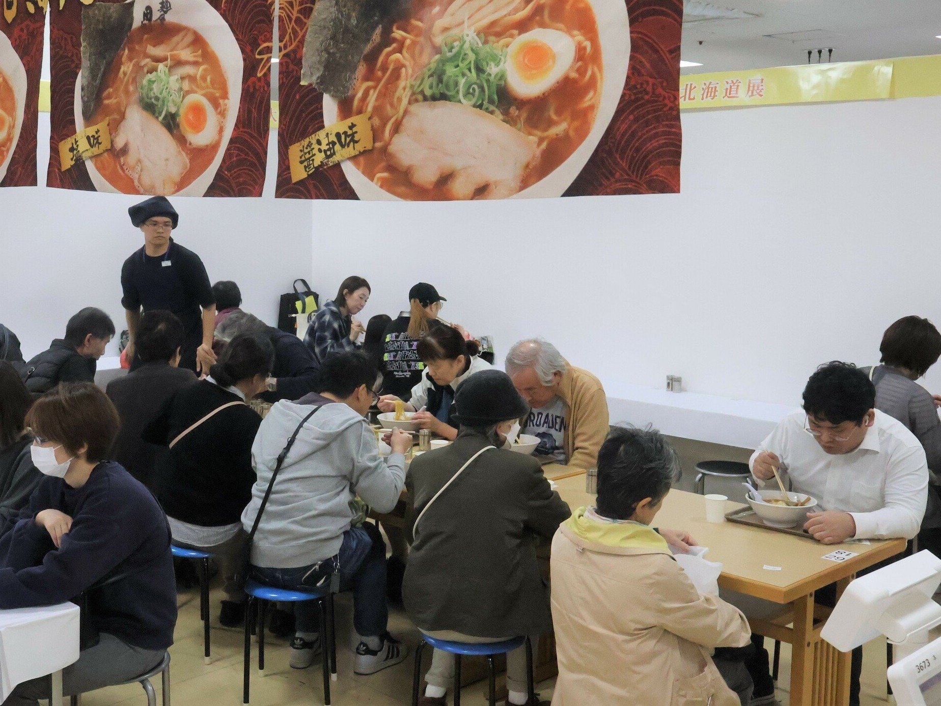 北の大地の旬やスイーツなどをそろえた41店が並んだ。甘エビをふんだんに使用したラーメンが人気の「田中商店」(増毛町)など3店舗が北陸初出店。北海道産のクリームにあんこを加えた「雪美堂」(札幌市)の生ドーナツなど実演販売のブースにも長い列ができた。