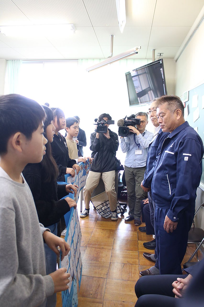 児童代表の4人が「おいしいカニを準備していただきありがとうございます」と感謝の言葉を述べ、塩谷組合長らにお礼の寄せ書きを贈った。