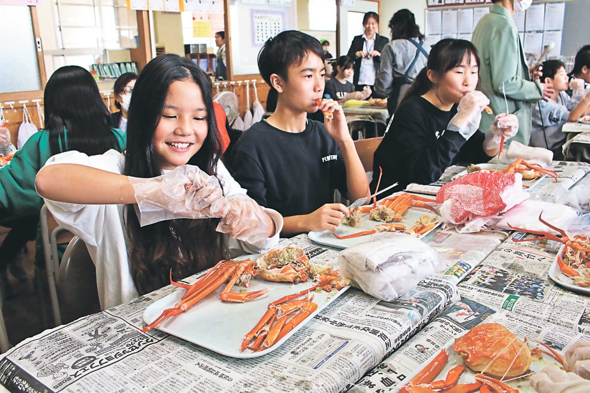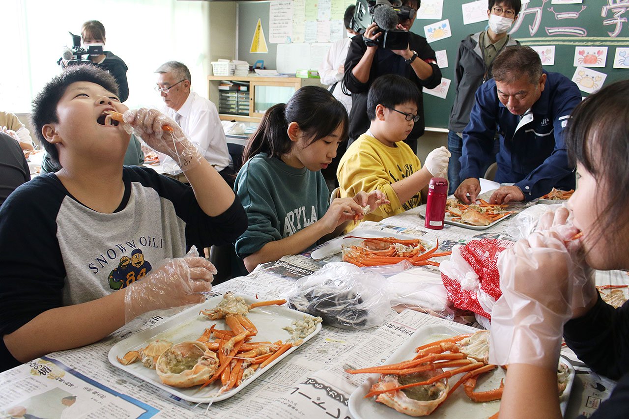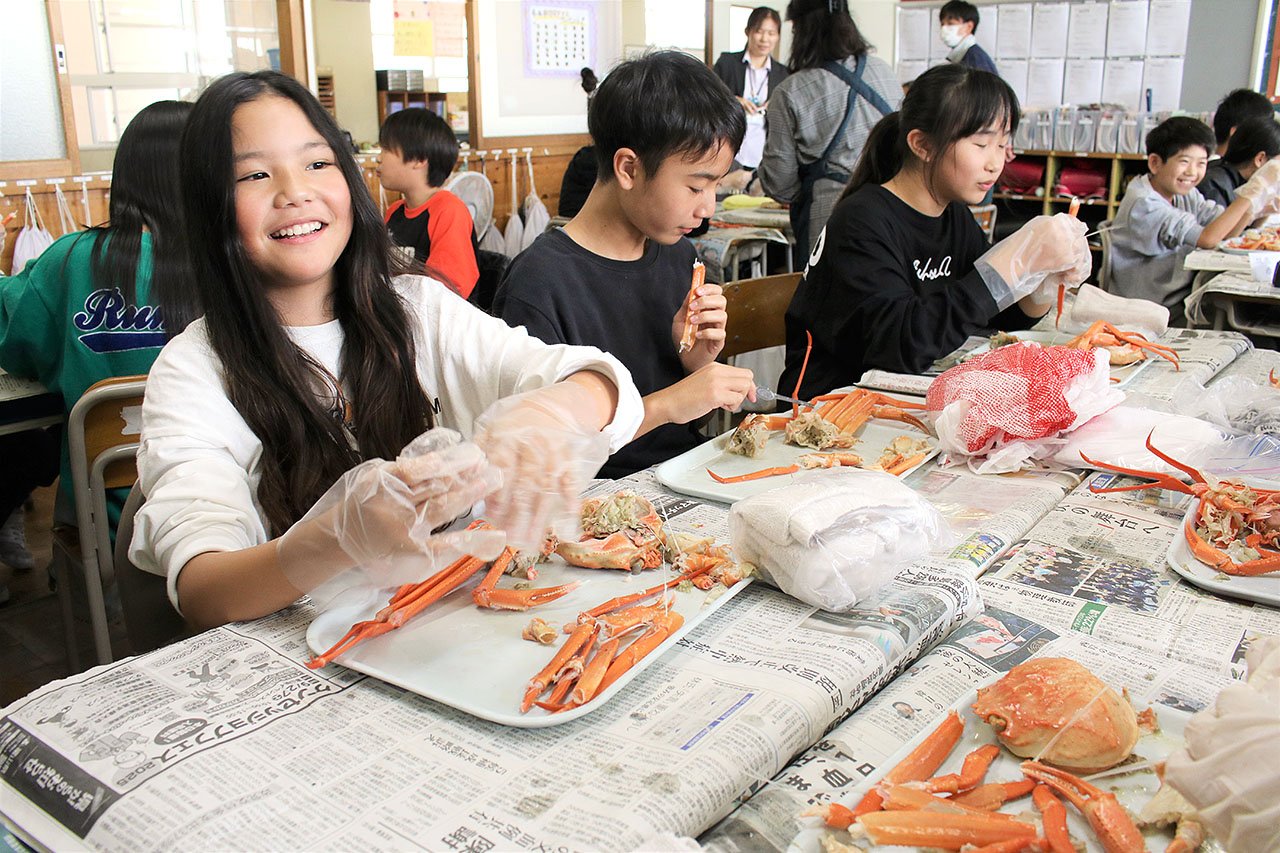 新湊放生津小でセレモニーがあり、金谷真教育長が「大人になってもこの味を覚えていてもらい、古里に誇りを持ち続けてほしい」とあいさつ。カニを提供する新湊漁協の塩谷俊之組合長は「新鮮なカニを食べてもらうため、県内で唯一昼セリをやっている。地元の漁業に目を向けてほしい」と呼びかけた。