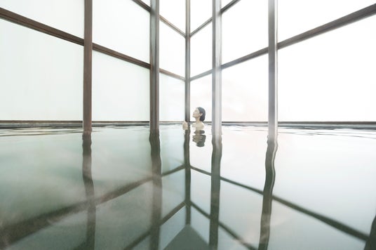 星のや軽井沢 宿泊者専用大浴場「メディティションバス」での入浴の様子