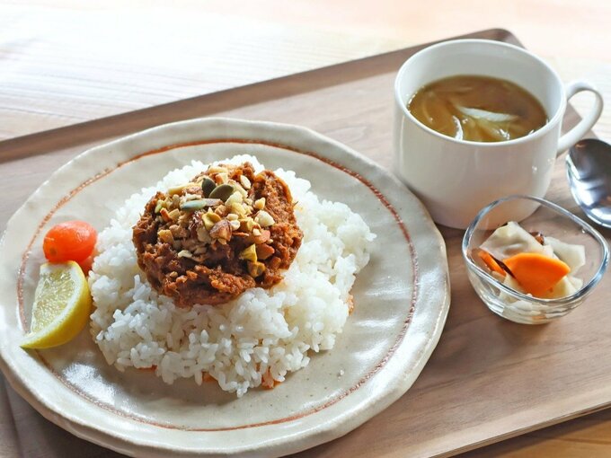 広い日本庭園を眺めながら、スパイスカレーや手作りのチーズケーキを味わえる。スパイスカレーは辛さ控えめで、じっくり煮込んだチキンのうまみがぎゅっと凝縮されている。店内は木のぬくもりが感じられる開放的な造りで、小上がりも備える。「時間を気にせず過ごしてもらえたら」と店主は話す。(情報は取材時の内容です)